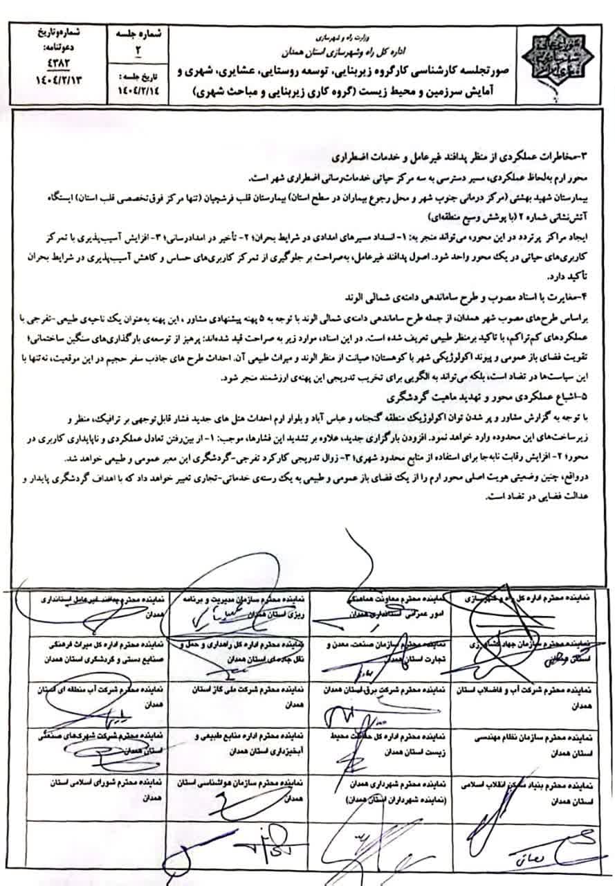 - مغایرت با اسناد مصوب: طرح پیشنهادی با الزامات طرح ساماندهی دامنه شمالی الوند و سایر اسناد بالادست مصوب در تضاد است که کاربری تفرجی، حفظ منظر طبیعی و کنترل بارگذاری در این پهنه را مورد تأکید قرار دادهاند.